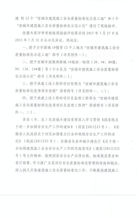 繼宣城市第二中學(xué)擴(kuò)建工程和茂盛景苑3期分別獲得2015年宣城市建筑施工安全質(zhì)量標(biāo)準(zhǔn)化示范工地(小區(qū))后,我公司承建的寧國(guó)市港口園區(qū)安置房西區(qū)1-9#樓工程再次獲得“市級(jí)安全質(zhì)量標(biāo)準(zhǔn)化示范小區(qū)”稱號(hào)。