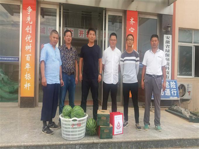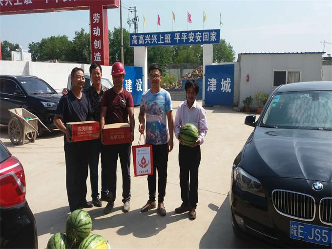 近日,公司副總經理鄔發興、總工程師王海賓隨公司辦公室、安質科人員,奔赴市區美都玉府、寧國城西小學和郎溪職教中心等多個項目部,為炎炎烈日工作在一線的崗位的員工送來防暑降溫物品。