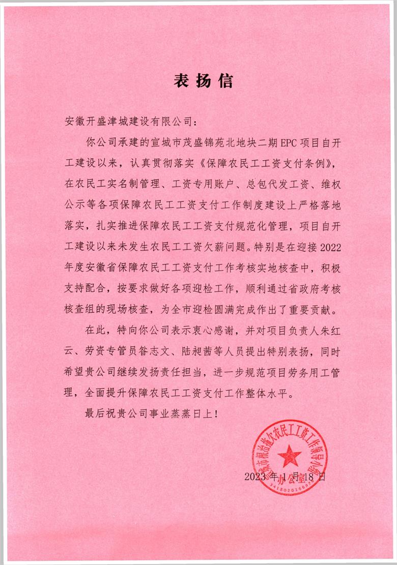 1月18日,宣城市根治拖欠農民工工資工作領導小組向我公司發來表揚信,就我公司承建的茂盛錦苑北地塊二期EPC項目自開工以來在落實保障農民工工資支付工作制度建設的突出表現,尤其是在迎接2022年安徽省保障農民工工資支付工作考核實地核查中,積極支持配合、按要求做好各項迎檢工作并順利通過省政府考核考查組的現場核查,為我市迎檢圓滿完成做出的重要貢獻表示感謝和表揚。